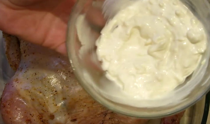 Mettre la carcasse sur une plaque à pâtisserie et tartiner de crème sure.