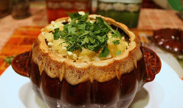 Râpez le poulet éviscéré à l'extérieur et à l'intérieur avec du sel, du poivre et de l'ail. Diluer les champignons et laisser mijoter jusqu'à tendreté avec des oignons et un peu d'eau. Au bout du ragoût, ajoutez des carottes râpées et du poivron finement hachés. Farcir le poulet avec les champignons et les légumes, coudre et faire revenir le gras restant. Faites cuire dans un plat à rôtir sous un couvercle, en ajoutant le bouillon et le vin. Retirez le poulet fini, coupé en morceaux. Ajoutez la farine et la crème sure au liquide restant du ragoût et faites cuire pendant 10 à 11 min la sauce avec laquelle les morceaux de poulet sont arrosés. Saupoudrer les champignons porcini du poulet dans la crème sure et de l'aneth haché.