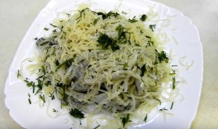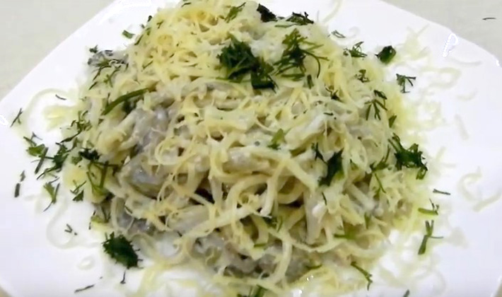Trempez les spaghettis dans de l'eau bouillante salée et laissez cuire 10-15 minutes en remuant de temps en temps. Puis déposer dans une passoire et mélanger avec du beurre fondu.Séparément, préparez la sauce Béchamel de champignons frais, tranchée et trempée dans du beurre. Mélanger les champignons bouillis et hachés avec les spaghettis, verser sur la sauce cuite et mélanger, puis cuire au four. Servez chaud sur la table.