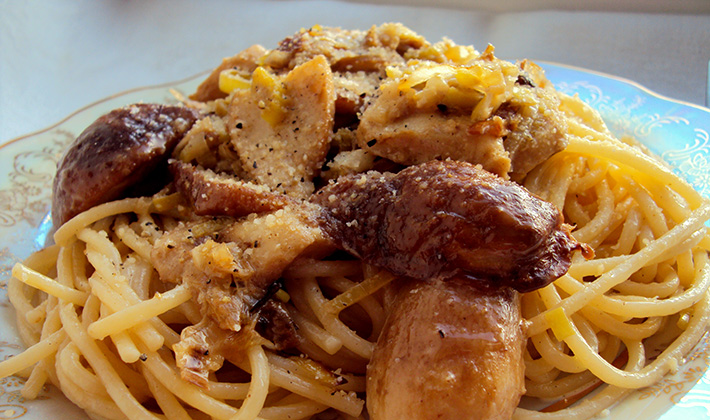Spaghetti aux cèpes et aux poireaux