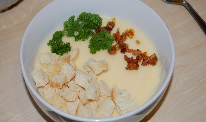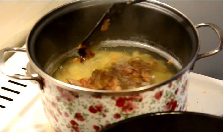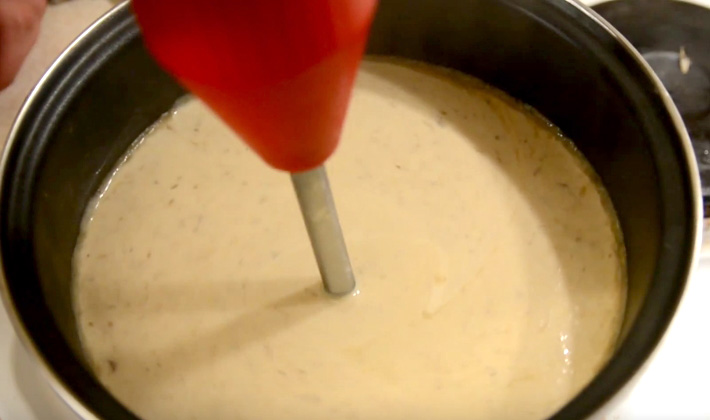 - Battre le lait, la crème et la farine jusqu'à l'obtention d'une consistance uniforme, verser dans la soupe et fouetter un peu avec un fouet.