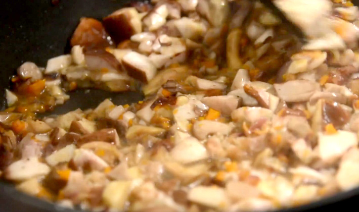 - Peler l'oignon, couper en cubes et envoyer aux champignons, continuer la friture pendant encore 10 minutes.