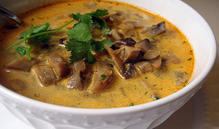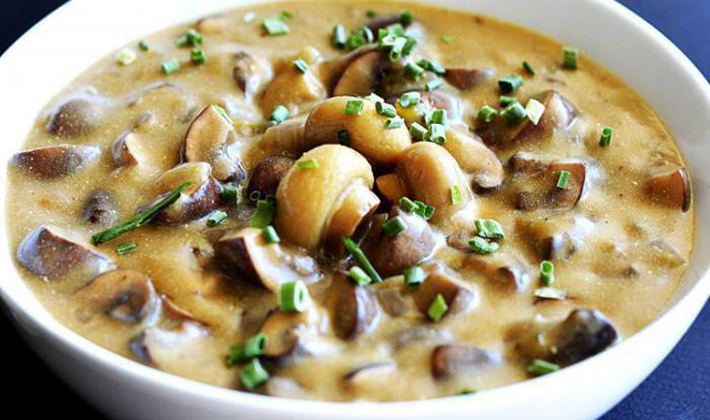 - Avant de servir, le cueilleur de champignons est assaisonné de crème sure et parsemé d’herbes finement hachées.