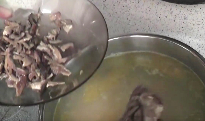 - Les champignons sont coupés en petits morceaux et injectés dans le bouillon.