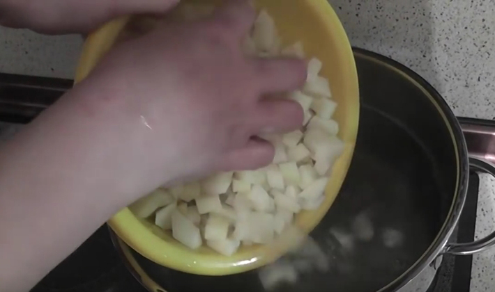 - Nous lavons l'orge et la mettons dans les champignons, faisons cuire pendant 30 minutes et pendant ce temps, épluchons les pommes de terre et les coupons en cubes.