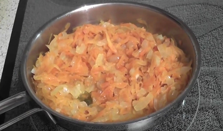 Hacher finement les oignons avec les carottes et les faire sauter dans l'huile végétale jusqu'à ce qu'ils soient dorés.