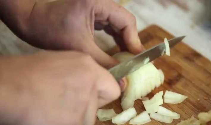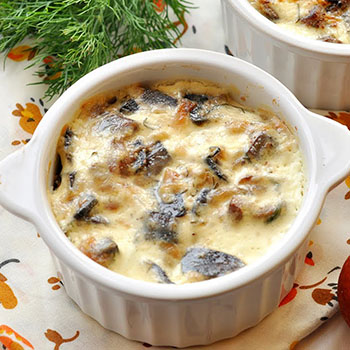 Épluchez, hachez et faites frire l'oignon dans le beurre fondu jusqu'à ce qu'il soit doré, puis ajoutez les cuisses de champignon coupées en rondelles et mettez à feu vif, en remuant constamment.