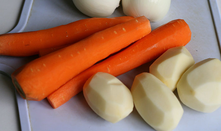 Lavez les pommes de terre et les carottes, épluchez-les et coupez-les en lanières.