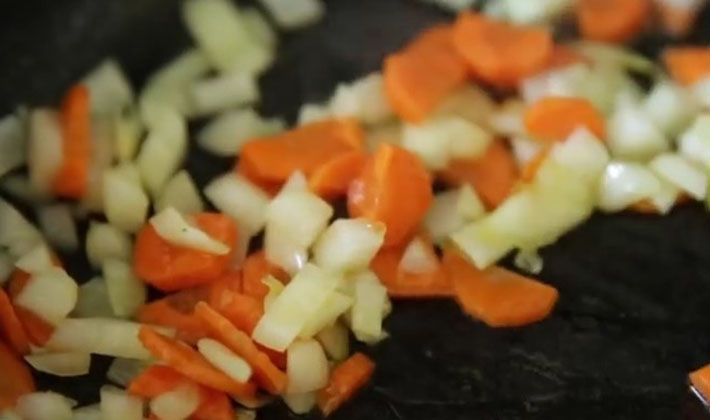 - Séparément, faire revenir les légumes-racines et les oignons dans la soupe de champignons porcini frais.