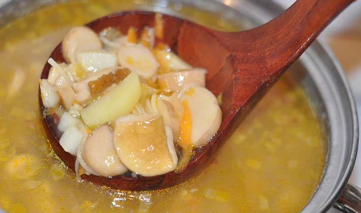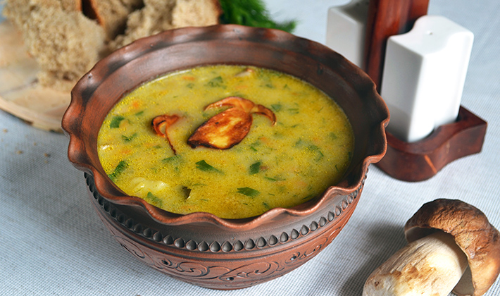 Pour préparer une soupe de champignons porcini avec des pommes de terre, versez les légumes dans de l'eau bouillante, salez et faites cuire jusqu'à tendreté. Les champignons frais sont soigneusement lavés, nettoyés, hachés finement, bouillis dans une petite quantité d'eau avec des oignons hachés. Le bouillon de champignons doit être filtré. Champignons assaisonnés avec de la farine mélangée avec du bouillon froid. Ajouter les pommes de terre et les légumes. Bouillir, saler, assaisonner avec du poivre, de l'aneth, du persil haché, de la crème sure. Servir avec des lasagnes (nouilles faites à la maison, coupées en petits carrés), du porridge à l'orge perlé, des boulettes.