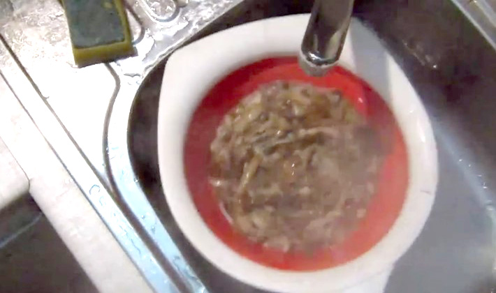 Jeter les champignons bouillis dans une passoire, rincer abondamment à l'eau froide, les couper en nouilles ou les hacher, les faire frire dans de l'huile végétale.