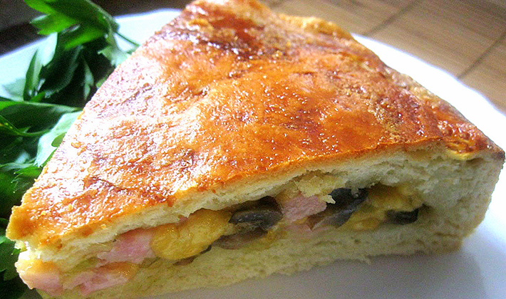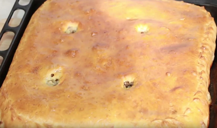 Étaler une couche de 1 cm d'épaisseur, la transférer sur une plaque à pâtisserie graissée, lisser la pâte, la lisser, la lisser avec les mains, la piquer à la fourchette et mettre la bouillie de sarrasin farcie de champignons.