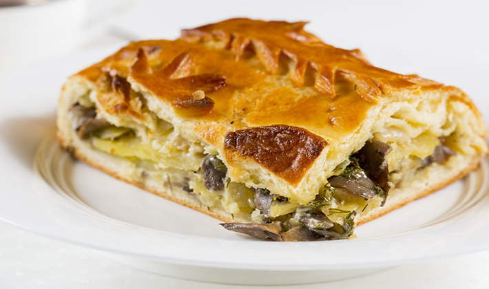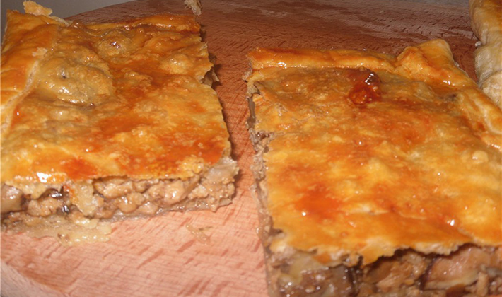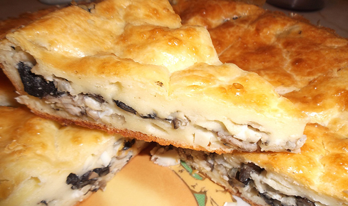 - Garnir la tarte de champignons porcini et de pommes de terre, graisser avec un œuf, saupoudrer de chapelure, faire des piqûres à la fourchette et mettre au four très chaud.