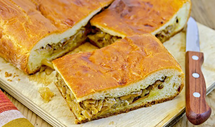 Rincer le chou et laisser mijoter sous le couvercle. Ajoutez une cuillère à soupe d'huile, des champignons hachés, des oignons émincés, des oignons frits à l'huile. Remuez le tout, salez et laissez mijoter jusqu'à tendreté. Alors cool. Abaisser la pâte à la levure et transférer sur une plaque à pâtisserie graissée. Mettre la garniture sur la pâte, faire une tarte aux cèpes et au chou, cuire au four.