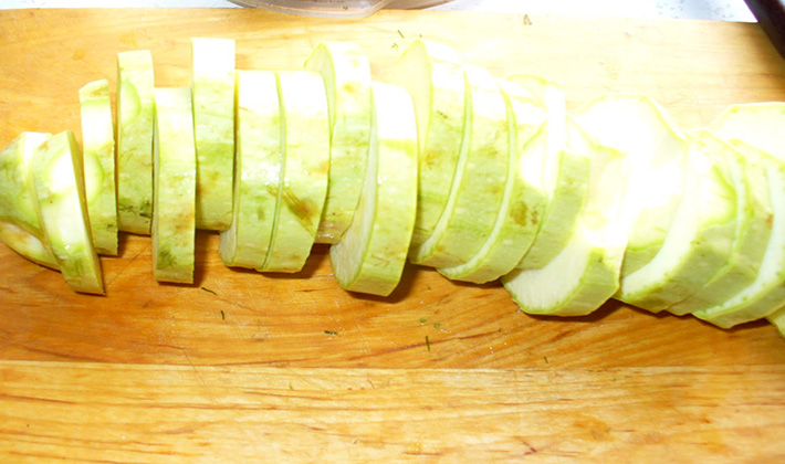 - Couper les courgettes en fines lanières et le saumon en fines tranches.