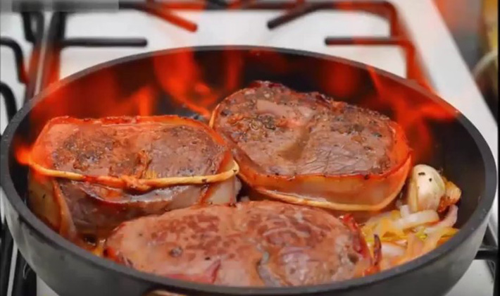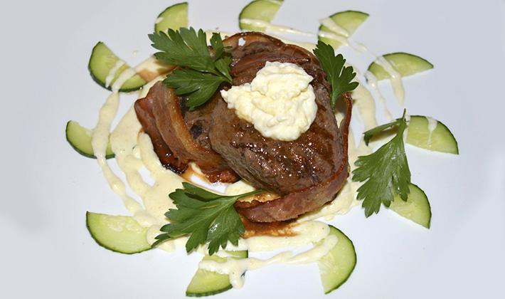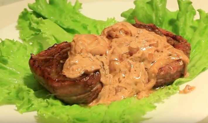 Couvrir de légumes frits, verser une sauce épaisse aux champignons sur le dessus des médaillons.