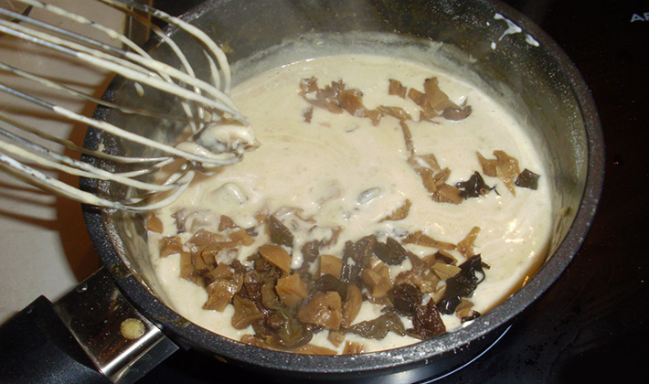 - Pour la sauce de champignons de porcini séchés avec de la crème, faites-les tremper dans le lait et épluchez-les, coupez-les en cubes et faites bouillir.