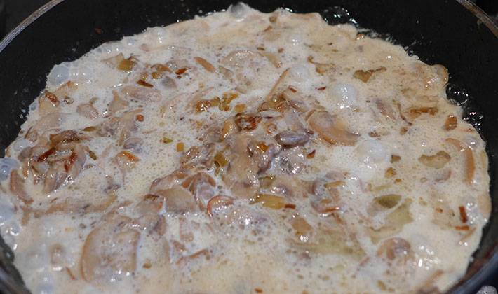 - Après cela, ajoutez la crème, portez à ébullition à feu doux la sauce aux champignons de cèpes et à la crème, en remuant constamment.