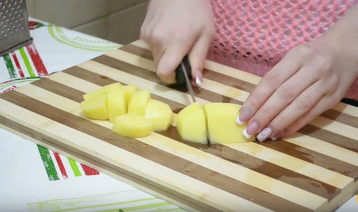 - Les pommes de terre pelées sont coupées en cubes et parsemées de champignons.
