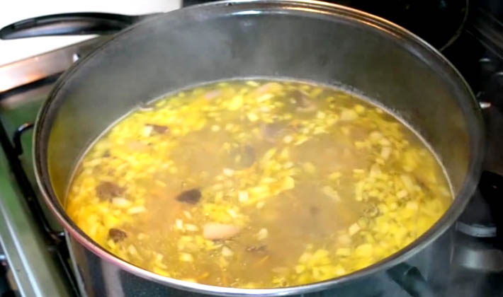Faire bouillir pendant 10 minutes et envoyer les champignons dans le bouillon, poursuivre la cuisson jusqu'à ce que les pommes de terre soient prêtes.