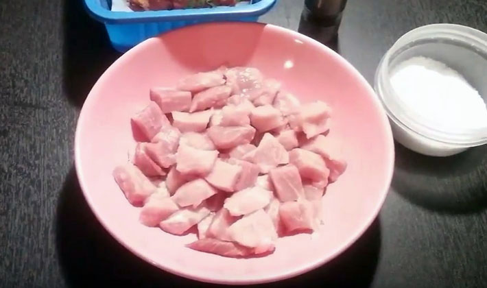 - Rincez le porc, séchez-le avec une serviette en papier et coupez-le en petits morceaux.