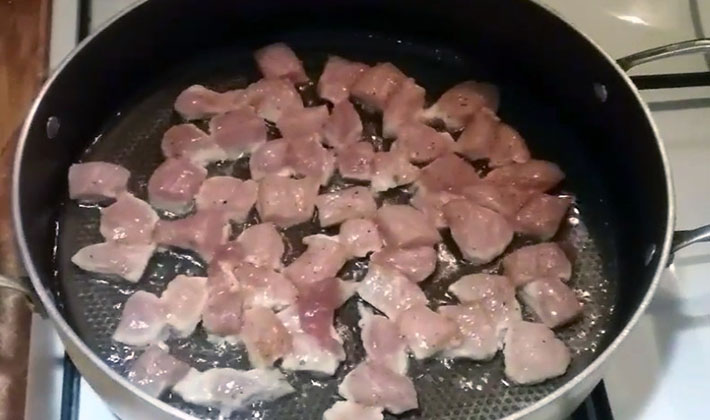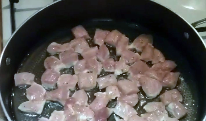 - Coupez la viande en cubes, faites chauffer l'huile dans une poêle et déposez la viande.