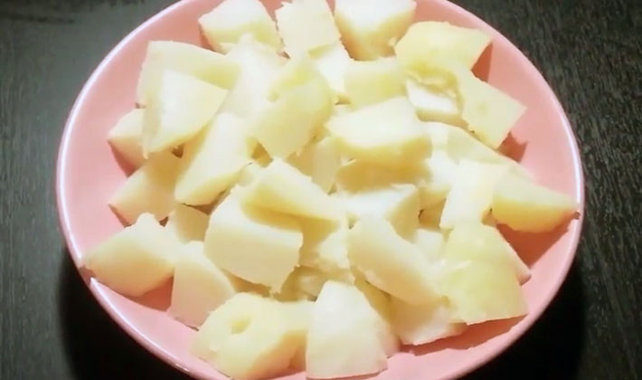 - La pomme de terre est pelée, lavée et coupée en cercles, frite dans l'huile jusqu'à coloration dorée à feu vif.