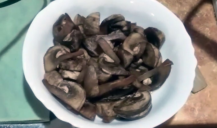 - Les champignons sont tranchés et frits dans une poêle sèche pendant 3-5 minutes.