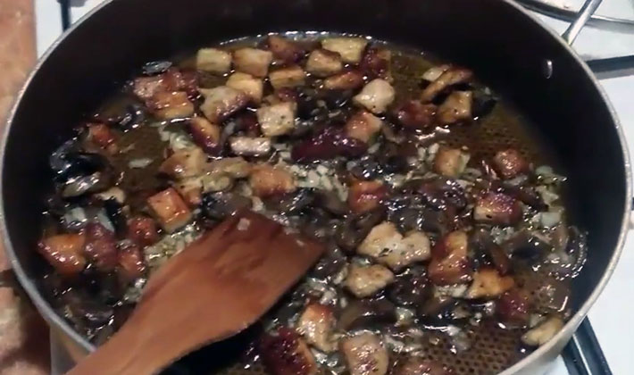 - Frire jusqu'à ce que doré et ajouter les champignons, mélanger et faire frire pendant 10 minutes.