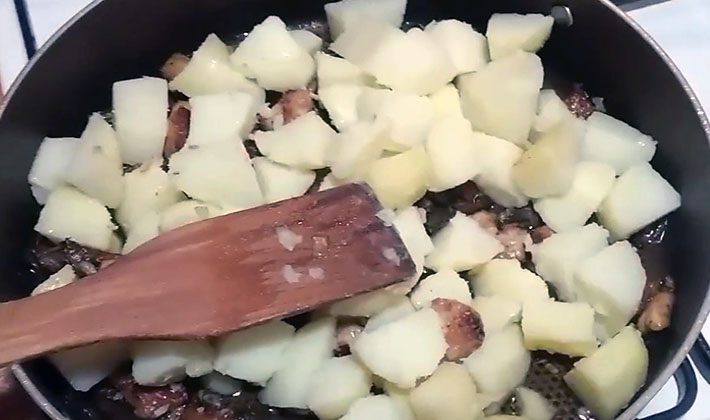 - Verser les pommes de terre, les champignons pour la viande, mélanger pour faire tremper dans la graisse et les épices.
