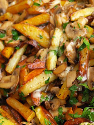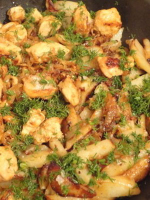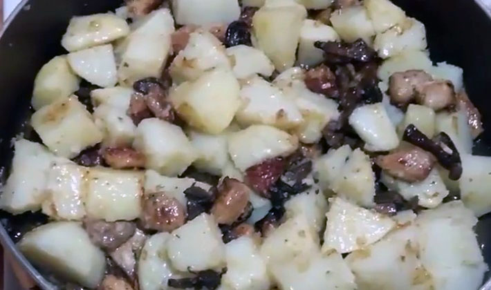 - Pommes de terre frites avec viande, oignons et champignons séchés