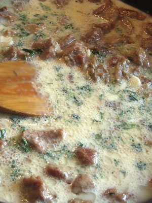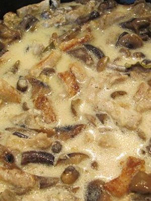 - La crème est mélangée avec de l'ail broyé, un peu salé et versée dans des pommes de terre avec de la viande et des champignons.