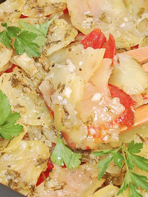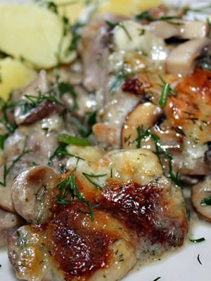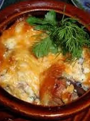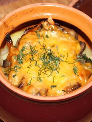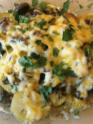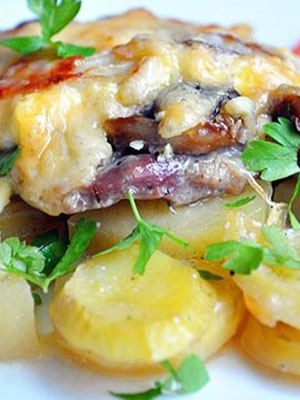 Recette de pommes de terre avec viande, champignons, fromage et ail
