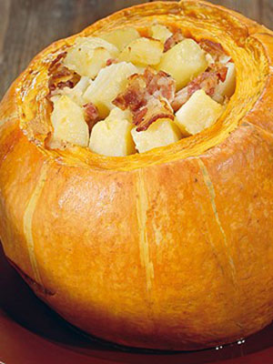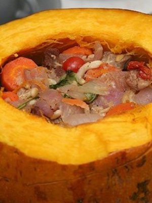 - Recette de pommes de terre avec viande, carottes et champignons cuits au four dans de la citrouille