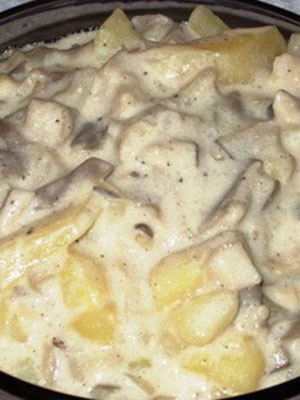 - Pomme de terre à la viande, aux oignons et aux champignons, cuite dans une casserole