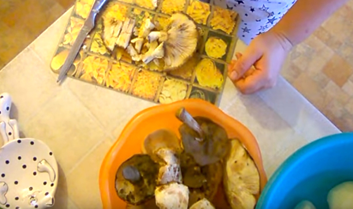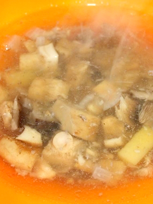 - Après le nettoyage et le trempage préliminaire, couper les champignons en tranches.