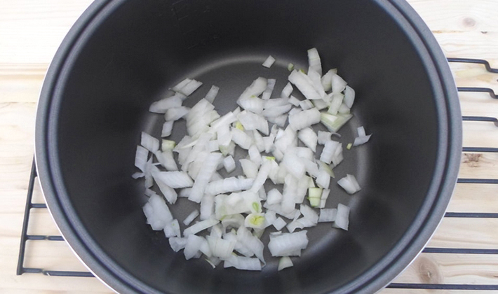 Mettez les champignons dans un bol séparé et mettez la mijoteuse en mode «Friture» pendant 15 minutes, mettez le beurre, l'oignon et faites frire jusqu'à ce qu'ils soient dorés.