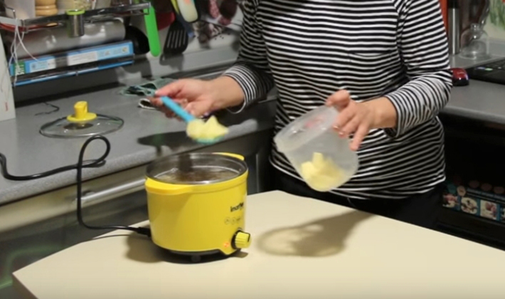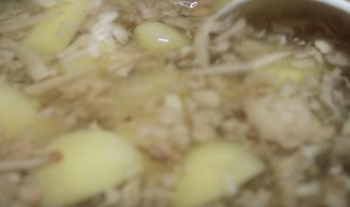 - Laisser le bouillon bouillir, éplucher les pommes de terre, les couper en cubes et les mettre dans le bouillon.