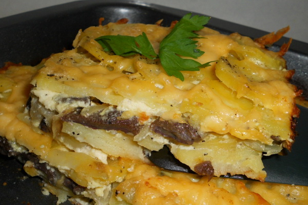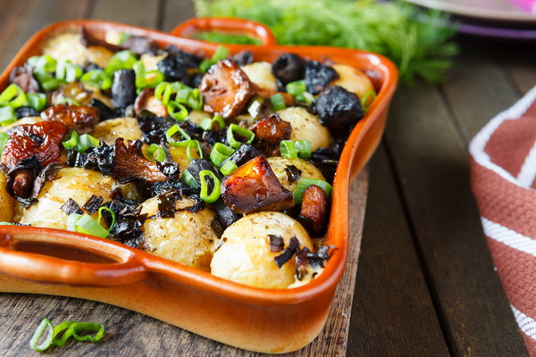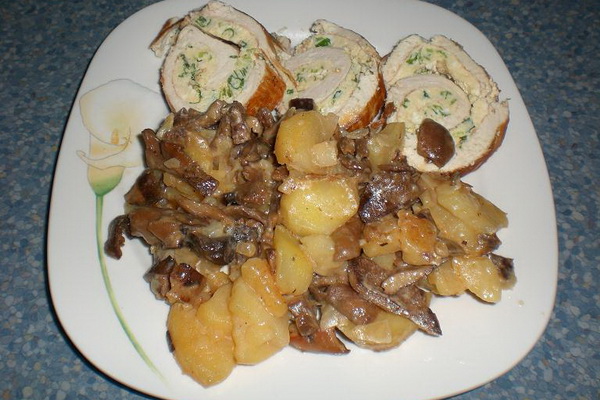 Cuisson: épluchez les pommes de terre, rincez-les, retirez le cœur avec un couteau. Hachez finement les champignons salés, ajoutez l'oignon sauté et la crème sure, mélangez puis faites frire le tout. Remplissez les pommes de terre préparées avec la viande obtenue, mettez-les dans une casserole, ajoutez la feuille de laurier, le sel, les herbes, la crème sure et laissez mijoter dans un récipient scellé jusqu'à ce qu'elles soient cuites. Au moment de servir, verser une assiette de champignons noirs salés avec du beurre.