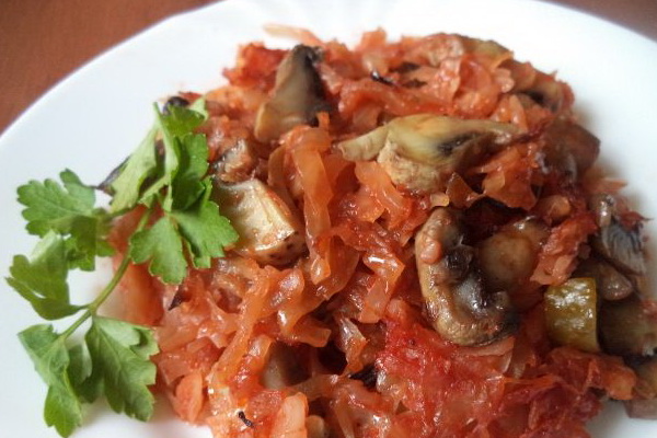 Hacher le chou, mettre dans une casserole, ajouter l'huile, un peu d'eau, le vinaigre et laisser mijoter pendant environ une heure. 15 à 20 minutes avant la fin du ragoût, ajoutez la purée de tomates, le concombre émincé, le sucre, le sel, le poivre et le laurier.