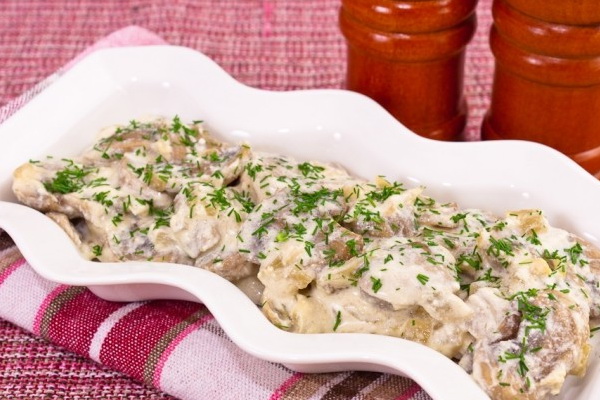 Rincer 800 g dans de l'eau, laisser tremper, mettre dans une passoire, rouler dans la farine, faire frire à l'huile dans une casserole. Puis versez 2 tasses de crème sure, saupoudrez de chapelure. Cuire un plat de champignons salés au four.