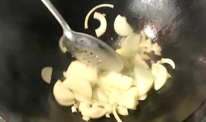 - Entrer l'oignon haché en demi-rondelles, mélanger et poursuivre la friture pendant encore 10 minutes.