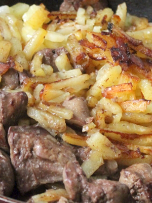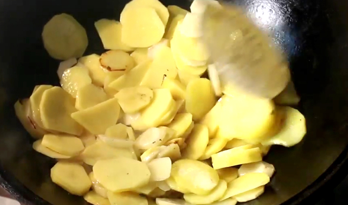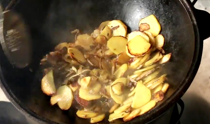 Ils sont introduits dans les pommes de terre avec des oignons et frits pendant 15 minutes, en remuant régulièrement, afin que la masse ne brûle pas.