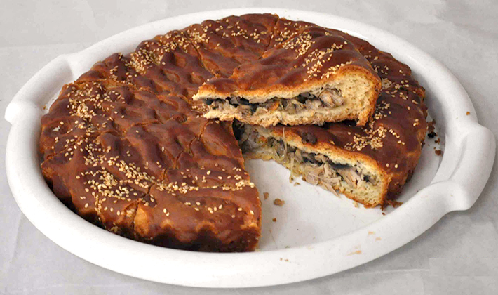 Étaler les 3/4 de la pâte préparée en une couche, déposer sur une plaque à pâtisserie graissée à l'huile végétale, mettre la farce dans la pâte avec une couche homogène et couvrir avec le reste de la pâte également roulée dans la couche.
