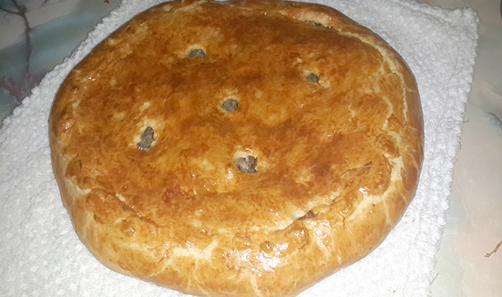 Avant de cuire des tartes avec des poitrines, une couche de levure, une pâte bien fermentée et appropriée doit être déposée sur une plaque à pâtisserie. Relevez les bords du jus de 1 cm et posez les poitrines salées de petite taille (pas plus que le diamètre d’un verre à facettes) en rangées serrées les unes contre les autres, plaques en haut. Pour chaque poitrine, mettez une petite quantité de viande hachée cuite dans de la crème ou de la crème sure. Couvrir le gâteau entier avec une fine feuille de pâte (0,5 cm) et cuire au four russe.