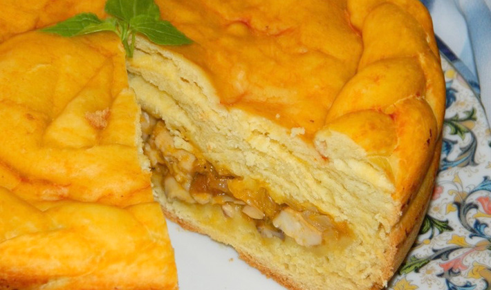 Pour faire un gâteau avec les poitrines crues, mélangez l'huile végétale avec le sucre et le sel, versez la bière avec le soda, trempé avec 6% de vinaigre. Puis, en remuant lentement, ajoutez la farine à une pâte fine. Diviser la pâte obtenue en deux, rouler en deux couches, chacune enveloppée dans une enveloppe et mettre au réfrigérateur pendant 1/2 heure, puis roulée à nouveau et enveloppée dans une enveloppe. Répétez donc 3 fois. Placez l'une des dernières coutures roulées sur une plaque à pâtisserie graissée à l'huile végétale, étalez la garniture sur une couche homogène, qui est recouverte d'une deuxième couture, pincez les bords de la pâte en cercle.