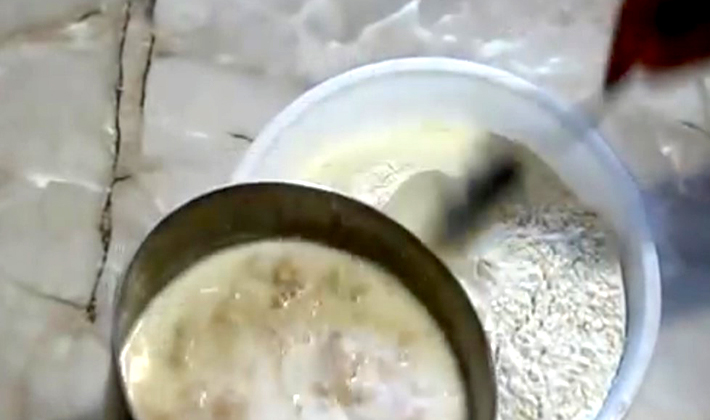 - mélanger la farine avec le soda, la crème sure, le sucre, le sel, mélanger jusqu'à ce que le sucre et le sel se dissolvent.
