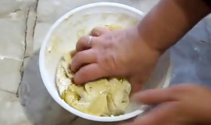 - Frapper le beurre prémariné ou la margarine dans un bol avec une spatule en bois pendant 10 minutes, ajouter progressivement un mélange de crème sure avec un œuf, puis rapidement (pendant 30 secondes) pétrir la pâte.
