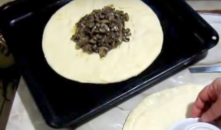 - Préparez de la viande hachée de champignons frais avec des oignons frits et de la crème sure mélangée à de la farine.