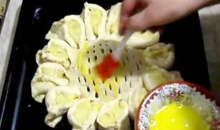 Graisser une tarte avec un œuf et cuire au four à feu moyen.